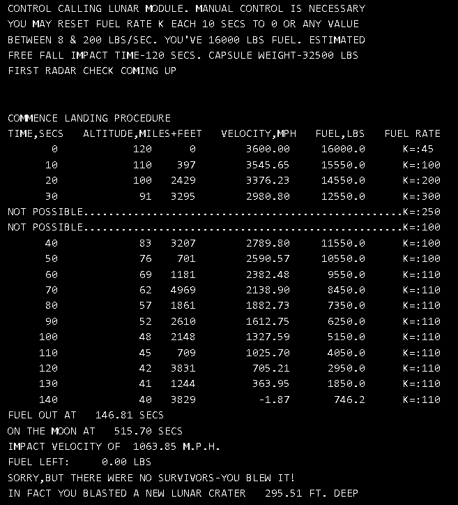 Em 1969, um estudante do ensino médio criou o primeiro simulador de naves do qual se tem notícia. Inspirado pelo pouso da Apollo 11 na Lua, Jim Storer, então com 17 anos, criou o programa usando uma linguagem chamada FOCAL e utilizou o computador PDP-8 da escola em que estudava, a Lexington High School. Era um jogo baseado em texto e chamava-se “Lunar Landing Game”. O próprio Storer relembra essa época em uma entrevista para o site Technologizer: “A Lexington High School tinha um PDP-8. Tinha uns 8 teletipos, um pequeno disco rígido e 12 KB de memória principal, onde 8 KB eram usados pelo sistema e os demais 4 KB eram compartilhados pelos usuários”. Posteriormente Storer submeteu seu jogo à DEC, fabricante do PDP-8, e que sempre estava à procura de usos inovadores e interessantes para seus computadores. Esses programas eram geralmente distribuídos gratuitamente ou usados como demonstrações para clientes em potencial, servindo como uma poderosa ferramenta de marketing. Assim como ocorreu com “Spacewar!” versões de “Lunar Landing” foram escritas para uma dezena de plataformas nos anos seguintes e você pode facilmente encontrar versões do jogo na internet até hoje.
