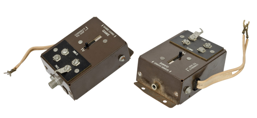 Outra peça que foi criada durante o projeto foi a caixinha de comutação TV/Game que, se você nasceu depois de 1990, nunca deve ter sequer visto uma. Só que ela se tornou obrigatória nos videogames que usavam a entrada de antena da TV (sinal RF). Curioso é que o engenheiro da Magnavox, George Kent, a criou para atender a uma nova norma da FCC — Agência que é o órgão regulador das telecomunicações e radiodifusão dos Estados Unidos, fazendo o mesmo papel que a ANATEL faz aqui no Brasil —, que limitava a quantidade de sinal RF que podia ser enviada acidentalmente para o aparelho de TV. Essa caixinha comutadora criada pela Magnavox acompanhou todo e qualquer videogame até que as entradas de áudio e vídeo do tipo RCA tornaram-se padrão nos televisores em algum momento dos anos 1990.